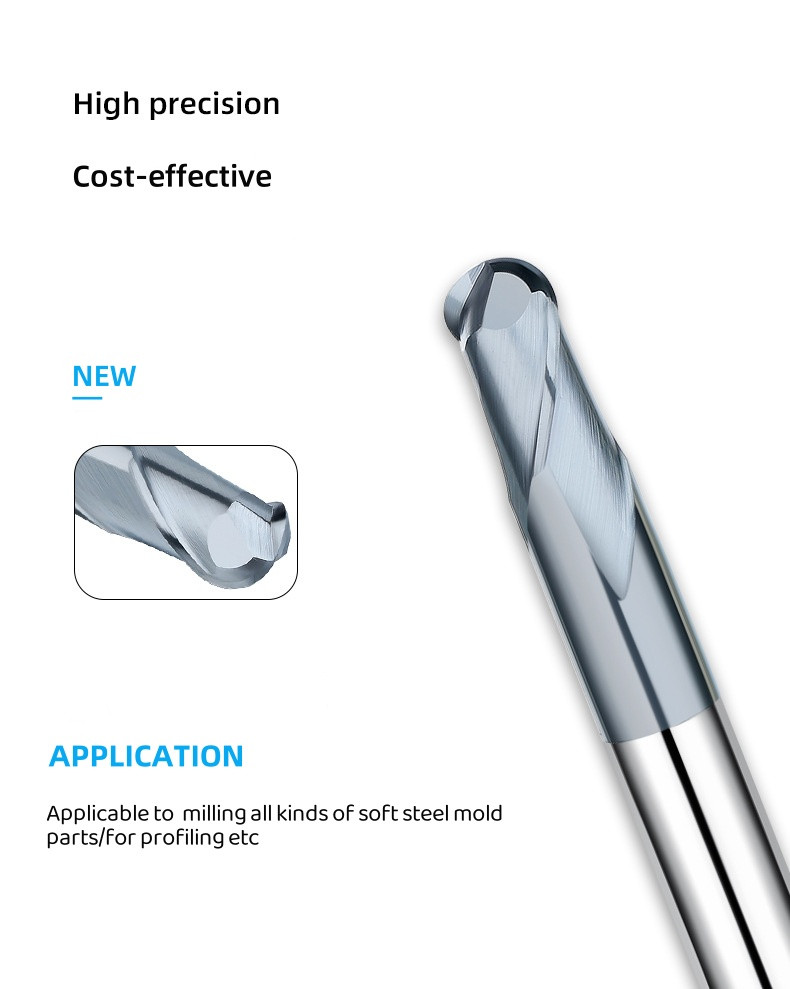 Carbide Ball Nose End Mills are precision tools designed for three-dimensional surface machining and high-precision contour cutting. Its spherical cutter head design enables it to efficiently complete the processing of complex geometric shapes. Carbide Ball Nose End Mills is widely used in mold manufacturing, aerospace, medical equipment, automotive parts and art carving and other fields.