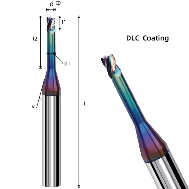 DLC coating is optimized for copper and copper alloy machining. Its good lubrication ability increases the 2 flute Long Neck Square End Mill's smoothness. Reduce Burrs and increase carbide tools life